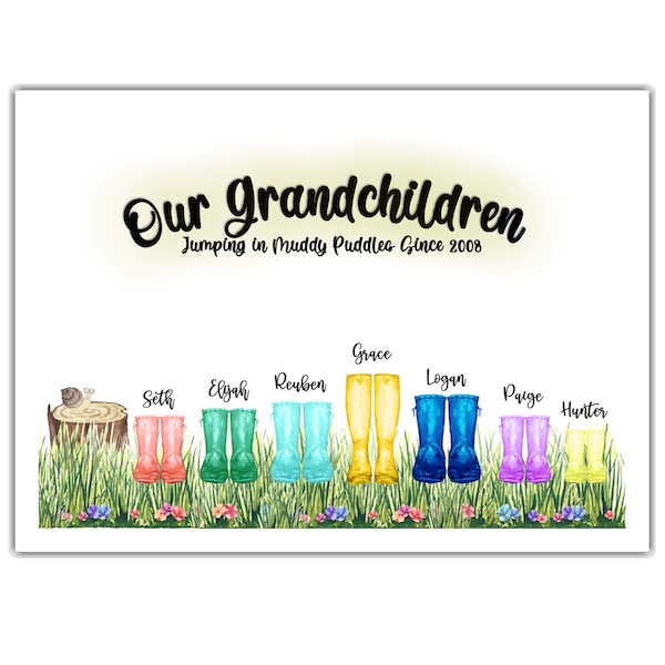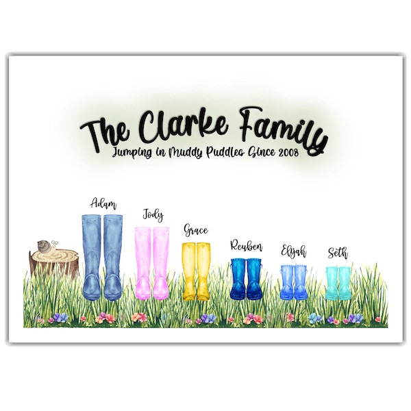 This stunning Welly Boot Family print is the perfect accessory to anyones home. It can also be a beautiful gift for family or friends. Totally customisable for any family. Grandparents will love one too.